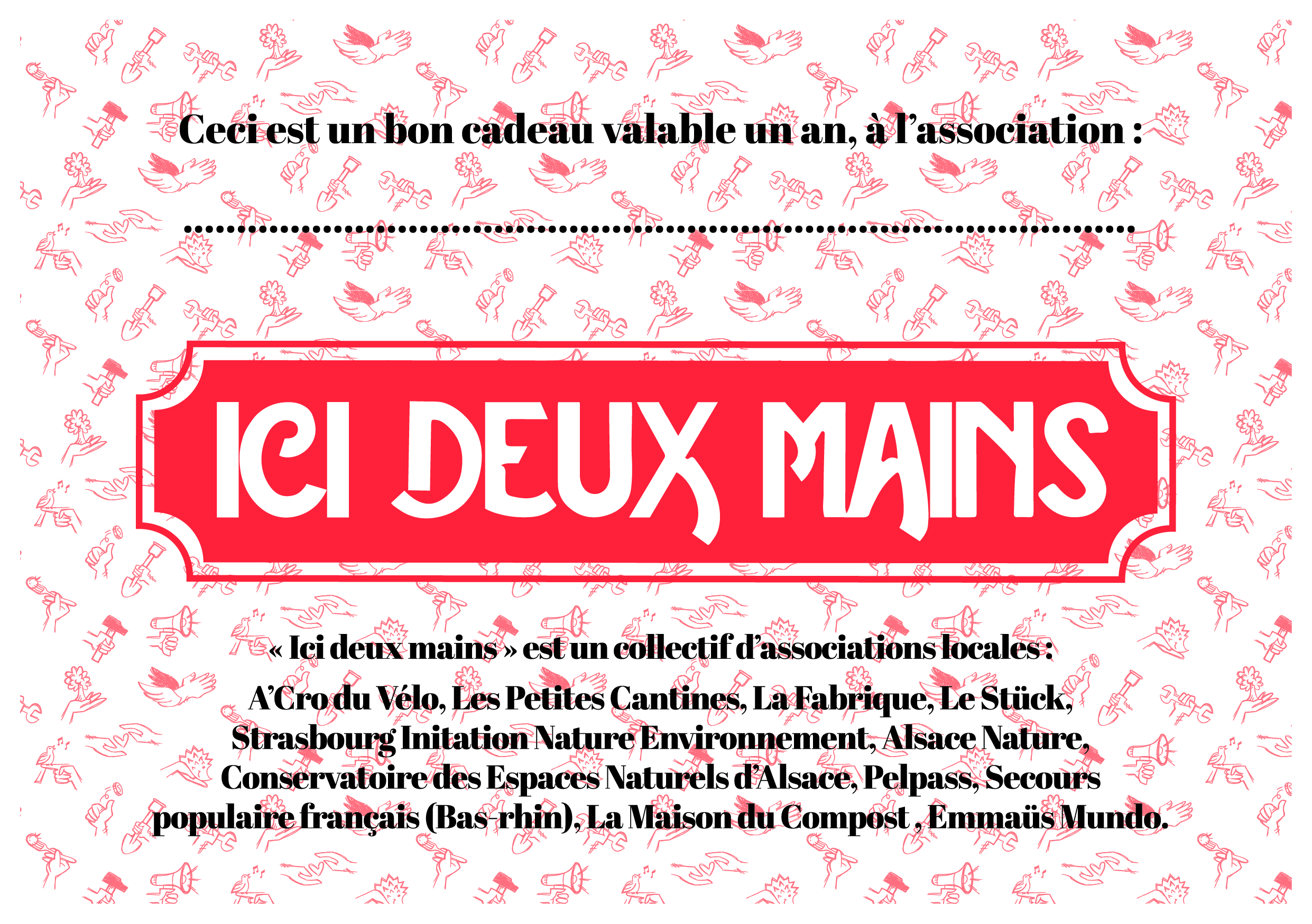 Les bons cadeaux ICI DEUX MAINS ont été sérigraphiés à l'atelier Papier Gâchette par Thérèse Partiot, et les mains dessinées par Hugo Mairelle et Manon Nisse.